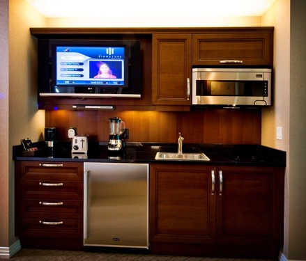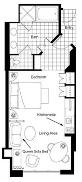 These Adjoining Suites feature 1100 square feet of living space with two full baths, two kitchenettes, two King beds featuring 300 thread count cotten sheets and two Queen Sleeper Sofas. These beautiful suites each feature large Flat Screen TVs and separate Sitting Areas with CD/DVD players. The Kitchenettes come fully equipped with high end appliances and daily supplies of coffee for your enjoyment. The spacious marble baths have a Whirlpool Spa tub that is perfect for relaxing and separate showers with additional Flat Screen TVs in the bathroom!